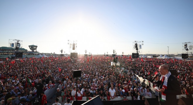 Atatürk Havalimanı'ndaki mitinge katılanların gösterdiği duruştan duyduğu memnuniyeti ifade eden Cumhurbaşkanı Erdoğan, "Gönül dünyanızdan gelen şu öfkeyi şahsım, milletim adına gerçekten selamlıyorum ve karşınızda ben de gerçek manada eğiliyorum. Ve Gazze'de çocukların, kadınların, masum insanların hunharca katledilmesi karşısında bizim, durmamız mümkün değildi. Ve siz de bugün bunu yaptınız ve 1,5 milyona yakın İstanbullu burada toplandınız. Allah sizlerden razı olsun. Rabbim yar ve yardımcımız olsun inşallah. Sağ olun, var olun" diye konuştu.