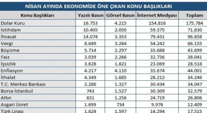 Medya Takip Merkezi (MTM), Ekonomi Gazetecileri Derneği için yaptığı araştırmada Nisan ayının ekonomi başlıklarını belirledi. Rapora göre; dolar, istihdam, ihracat ve vergi, gündemi belirleyen ana konular oldular. Araştırmaya göre, dolar kuru 175 bin 784 haber ile ekonomi gündeminin zirvesine oturdu. Enflasyon ise 44 bin 1 habere konu olarak 8'inci sırada yer aldı. Ay boyunca konuşulan ana konulardan biri de yerel seçimlerin ekonomiye olan etkileriydi.